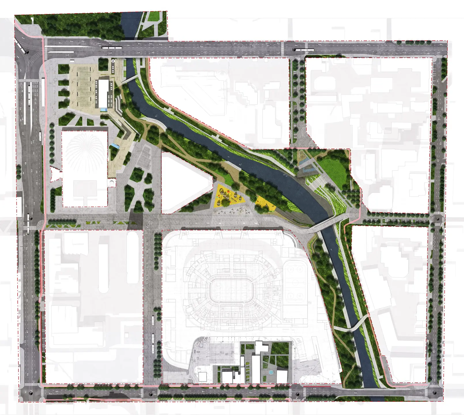 Строительство Арены в центре города поставило новые задачи. Ранее было принято решение, что окружающие 18 гектаров общественной территории будут полностью интегрированы с соседними городскими территориями. Пространства должны стать доступными и комфортными для жителей не только во время крупных мероприятий, проходящих в комплексе, как это часто бывает рядом с крупными стадионами, но и все двенадцать месяцев в году, семь дней в неделю. Они должны быть неотъемлемой частью зеленой инфраструктуры города, предлагая различные сценарии. Данный проект не только выполняет эти требования и соответствует строгим нормам безопасности, но и создает недостающее звено между функциональными и материальными элементами городской ткани. В основе проекта лежат две перпендикулярные оси.